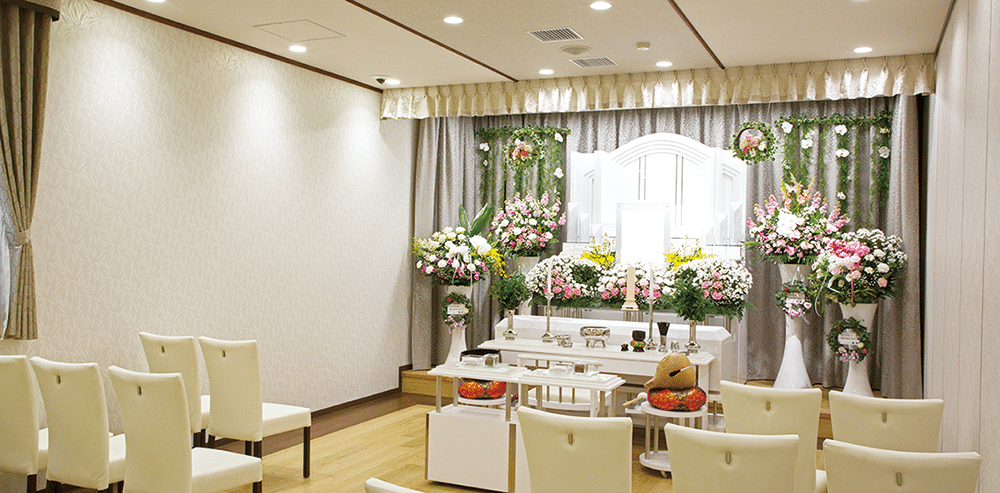 1日1家族様貸切の建物は、全体的に明るく落ち着いた雰囲気で、ゆっくりとご利用頂ける個室タイプのご安置室を完備しておりますので、事情がありご自宅でご安置できない方も安心です。また、親しいご家族・ご親族の方を中心としたご葬儀だからこそ、皆様で寄り添って心温まるお別れの時間を過ごして頂きたいという思いから、想いを込めた様々なおもてなしをさせて頂いております。